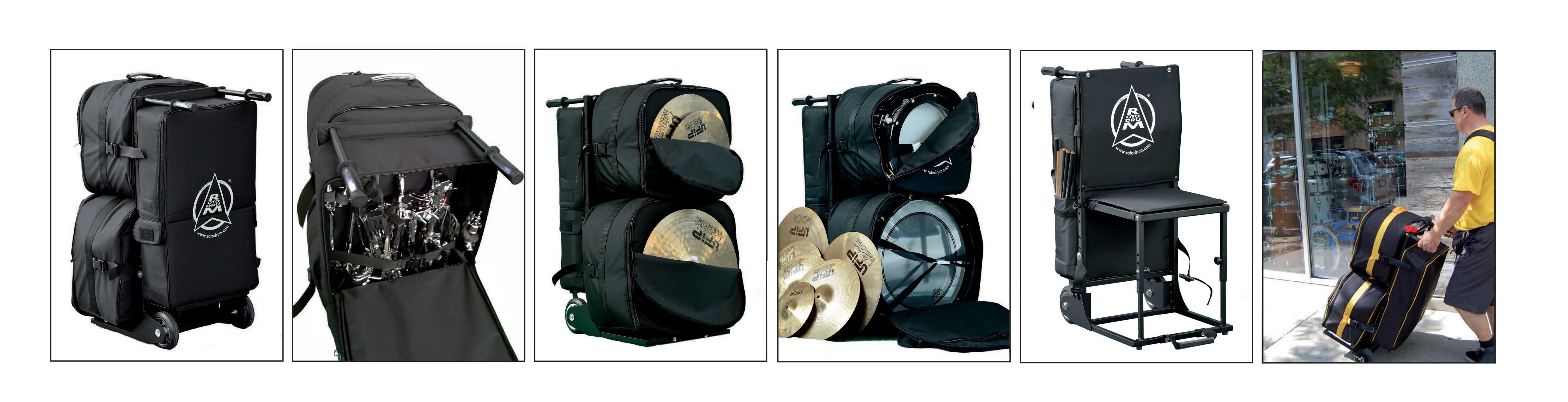 RotoTROLLEY is the answer. It's composed by the trolley equipped with a comfortable throne with adjustable height and these size drums: t 12" - 14" ft - bd 20" - s 14" (drums should be placed in two bags in front). Your cymbals and HH can be inserted in the front pockets, and the hardware and pedals can be put in the back in the appropriate bag. The size 22" x 18" x 39" allows you to be able to transport it enter in all any car, train, metro and or bus. It’s a great idea, especially for those who don’t have their own vehicle and use public transport or must walk for a long time, carrying the entire drum set.